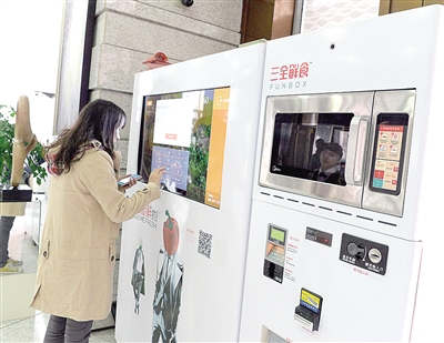 11月18日,一名女士在盒饭自动售卖机上输入订餐号取盒饭。当日,“盒饭自动售卖机”亮相上海北外滩。人们可用手机APP订餐后从盒饭自动售卖机取餐。赖睿宁摄(新华社发)